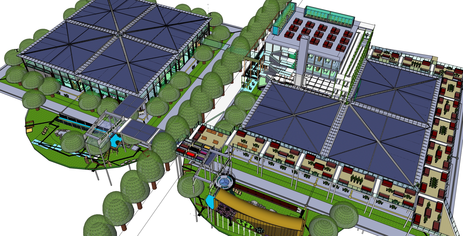 *   built in an open garden; with associated cafe or canteen